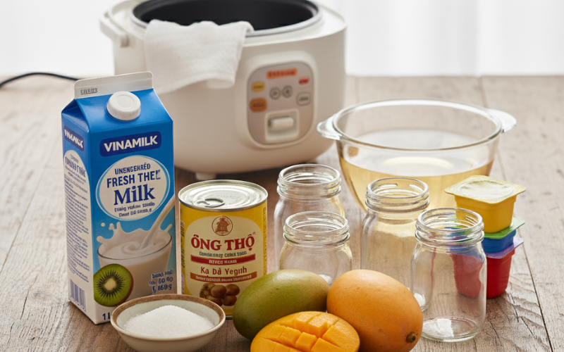 - Hũ đựng sữa chua (hũ thủy tinh hoặc nhựa)
